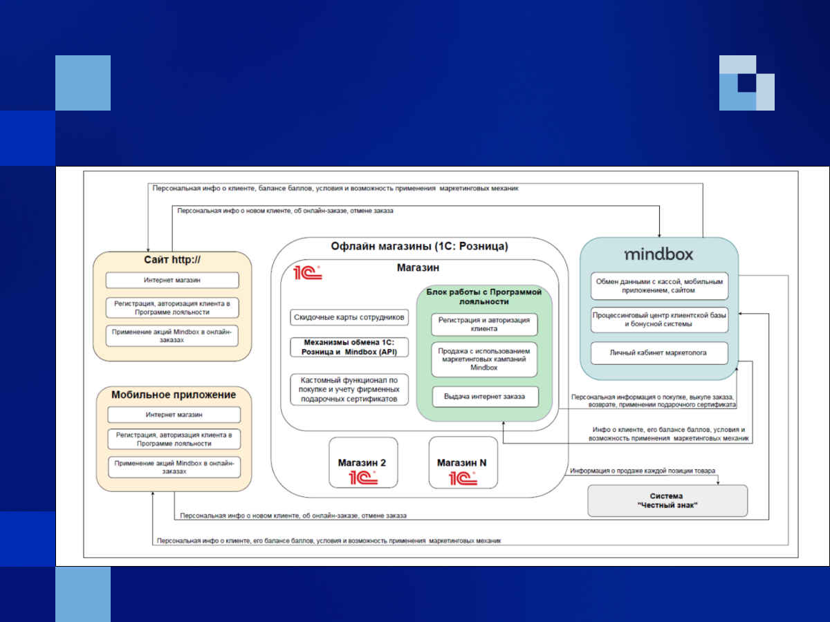 - Проектирование комплексной архитектуры интеграции 1С: Розница 2.3 (РИБ и узлы), сайта компании, мобильного приложения и платформы управления маркетингом Mindbox;