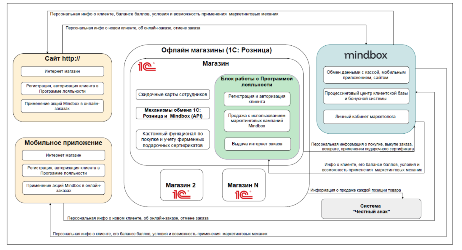 Основная архитектурная цель заключалась в добавлении в систему 1С: Розница возможности обмена с внешней системой Mindbox по API. Решение было встроено в существующую архитектуру распределенной информационной базы (РИБ) для обеспечения корректного обмена данными между всеми узлами системы и поддержки функционала программы лояльности в процессах продаж, возвратов, учета клиентов и маркетинговых активностей.