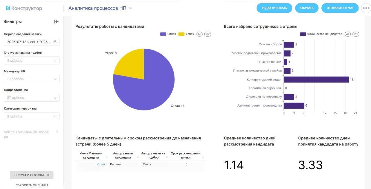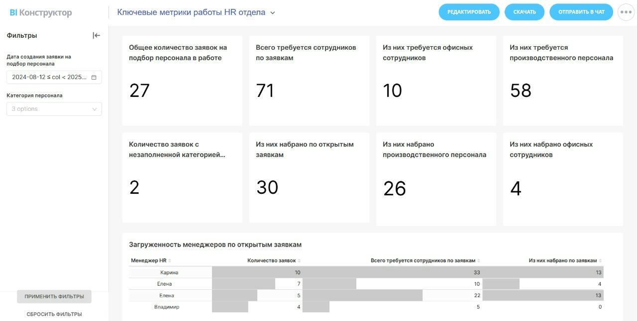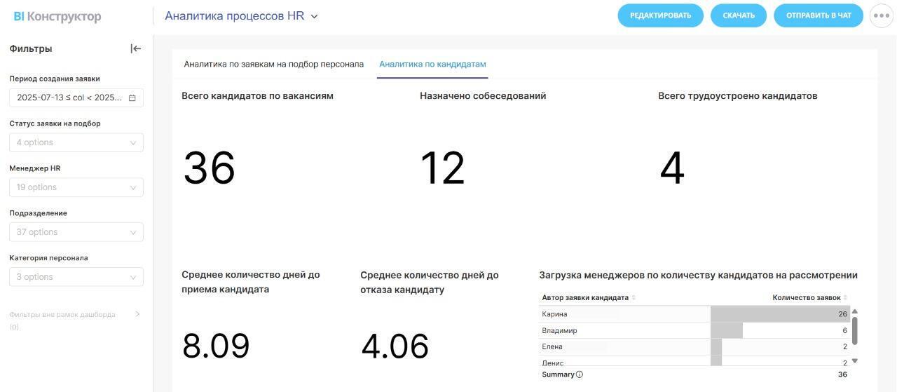 Для HR-отдела: Внедрение BI-системы кардинально изменило подход команды к работе с данными. Менеджеры могут в режиме реального времени отслеживать узкие места в процессах подбора. Система автоматически выявляет заявки с нарушением SLA, отправляя уведомления ответственным сотрудникам и их руководителям. Особенно ценным стало автоматическое распределение нагрузки между менеджерами. Система показывает текущую загрузку каждого менеджера в реальном времени, что позволяет принимать обоснованные решения о назначении ответственных. В результате административная нагрузка на HR-команду сократилась на 15 часов в неделю, которые теперь направляются на непосредственную работу с кандидатами.