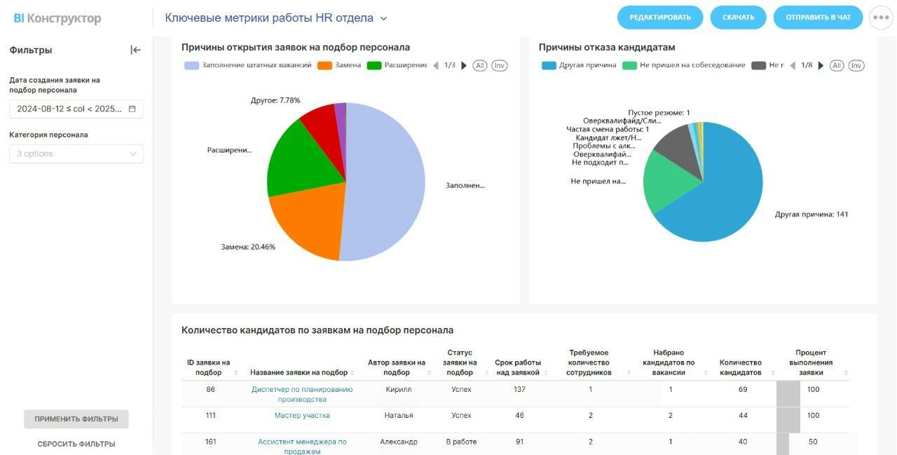 Нижняя часть дашборда содержит стратегическую аналитику: распределение потребности в персонале по категориям, анализ причин открытия заявок в динамике, сводную статистику по причинам отказов кандидатов. Эта информация важна для стратегического планирования HR-активности и бюджетирования затрат на персонал.
