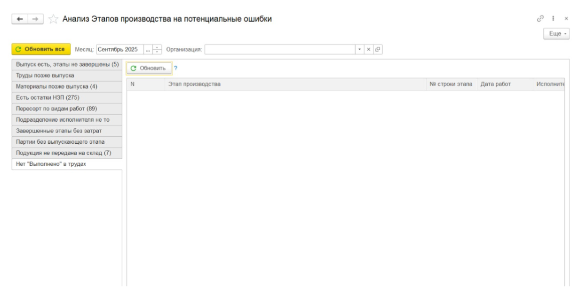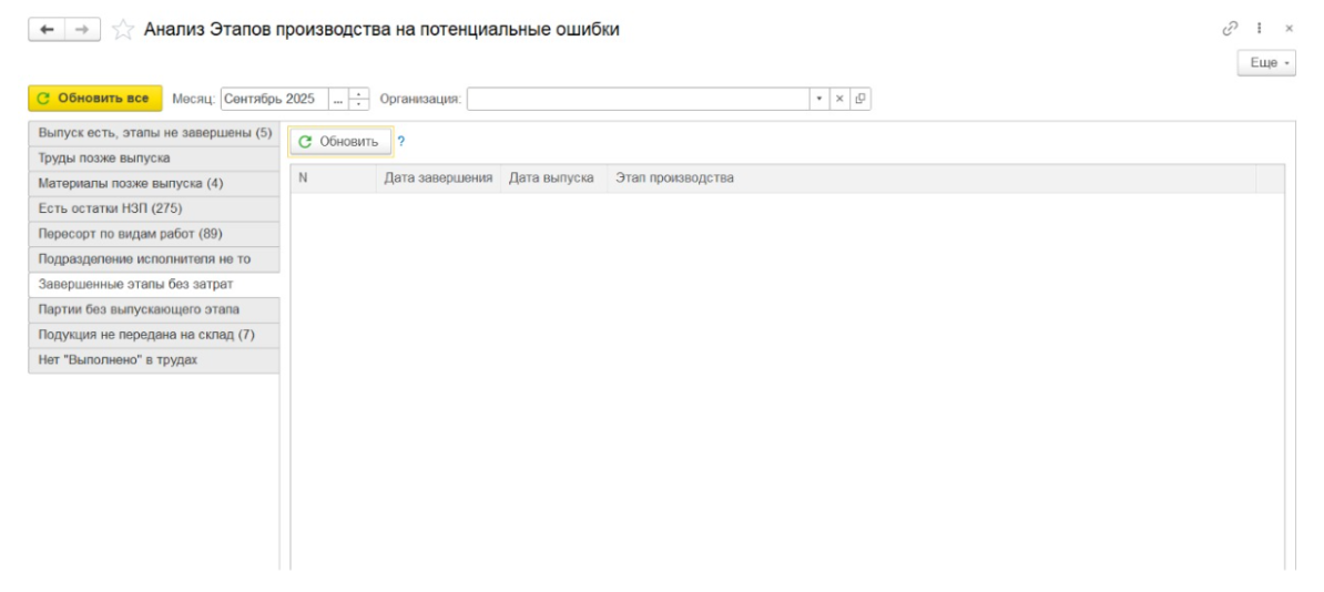 Находит этапы производства, отмеченные как завершенные, но не содержащие материальных или трудовых затрат. Такие ситуации могут указывать на формальное закрытие этапов без фактического выполнения работ, что также может исказить расчёт себестоимости выпущенной продукции.