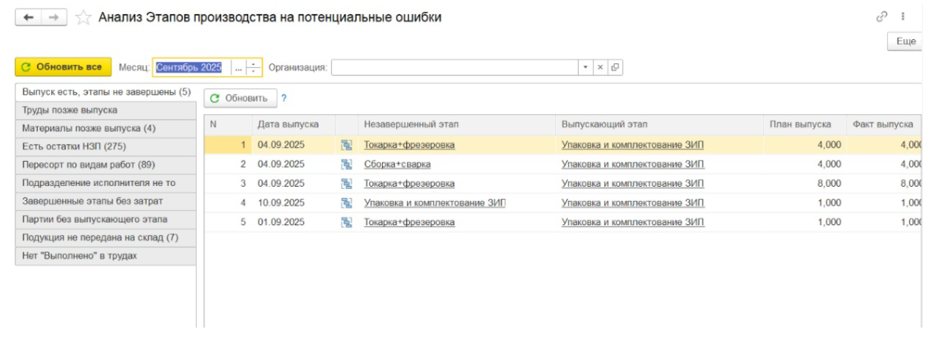 Выявляет ситуации, когда по заказу зафиксирован выпуск продукции, но остались незавершенные технологические этапы внутри 1С:ERP. Это нарушает логику учёта производственного процесса, поскольку продукция должна быть выпущена после полного завершения всех предусмотренных операций.