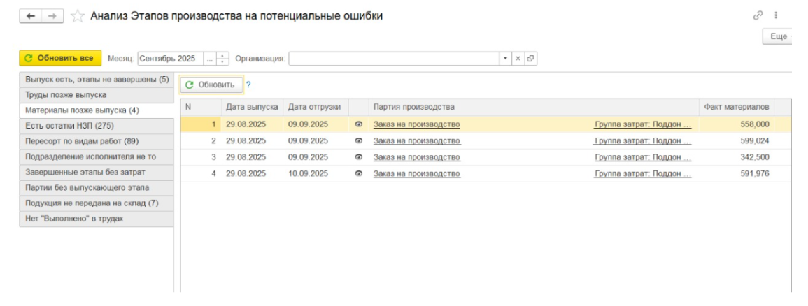 Выявляет ситуации, когда трудозатраты отражены в системе позже даты выпуска продукции. Для обеспечения корректной последовательности учетных операций рекомендуется фиксировать все выполненные работы до момента оформления выпуска готовой продукции, что позволяет поддерживать точность производственного учета и соответствие фактической логике производственного процесса.