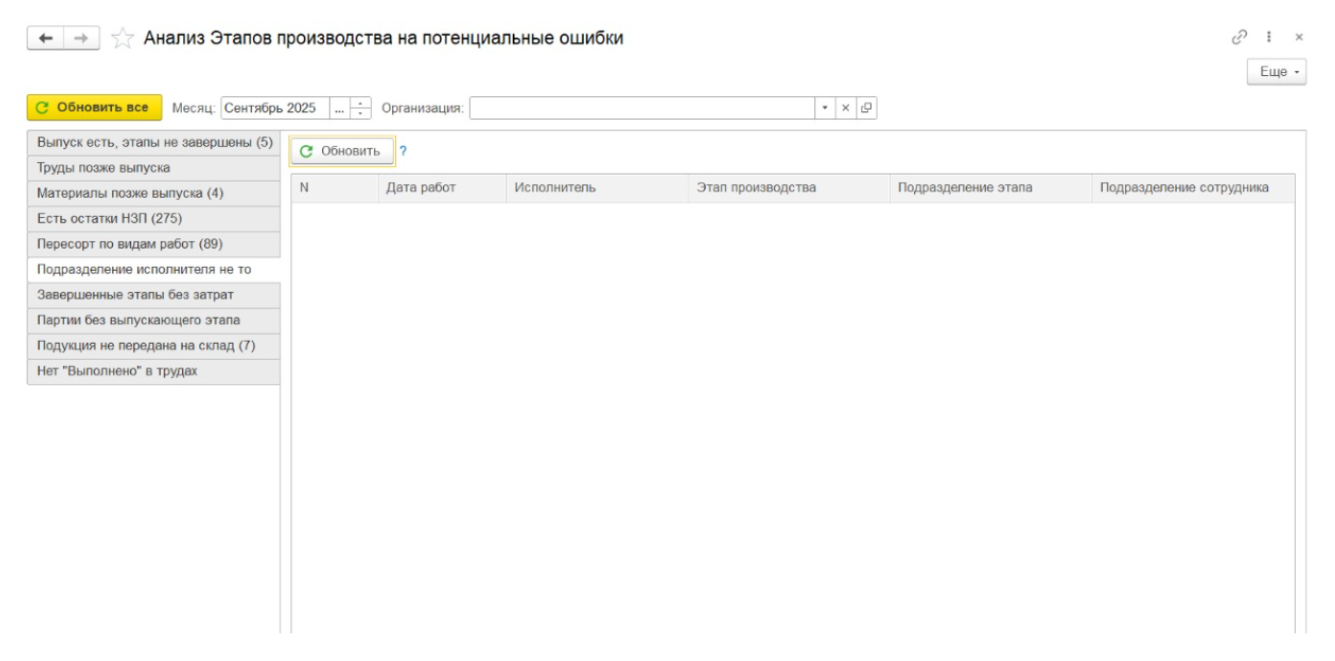 Контролирует соответствие подразделения исполнителя работ подразделению, указанному в этапе производства. Нарушения могут указывать на недочёты в планировании или некорректное оформление документов.